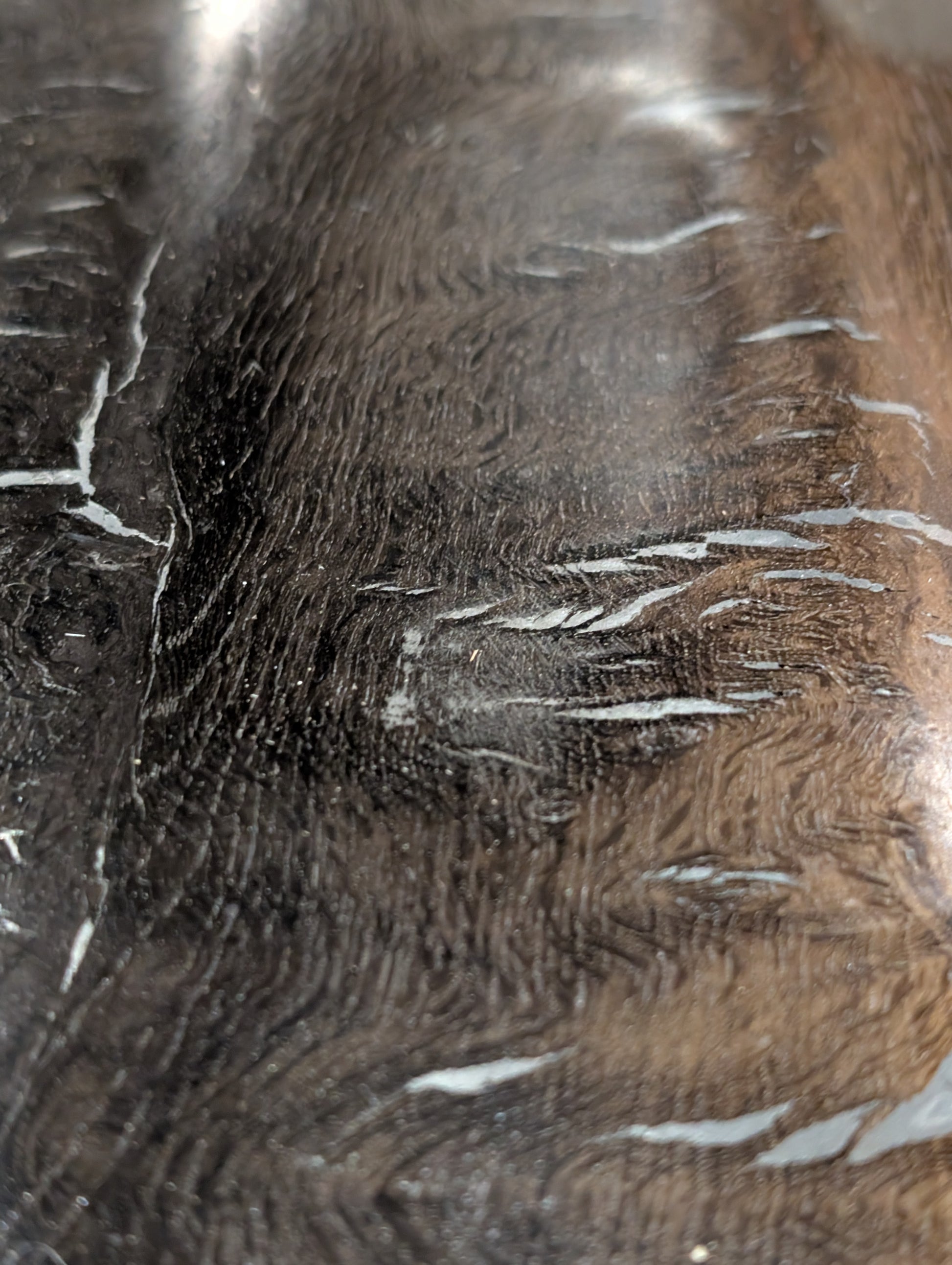 Crafted from two pieces of bog oak, the sides of the table join to the top in a 'waterfall' effect with the right brown grain cascading from top to bottom.