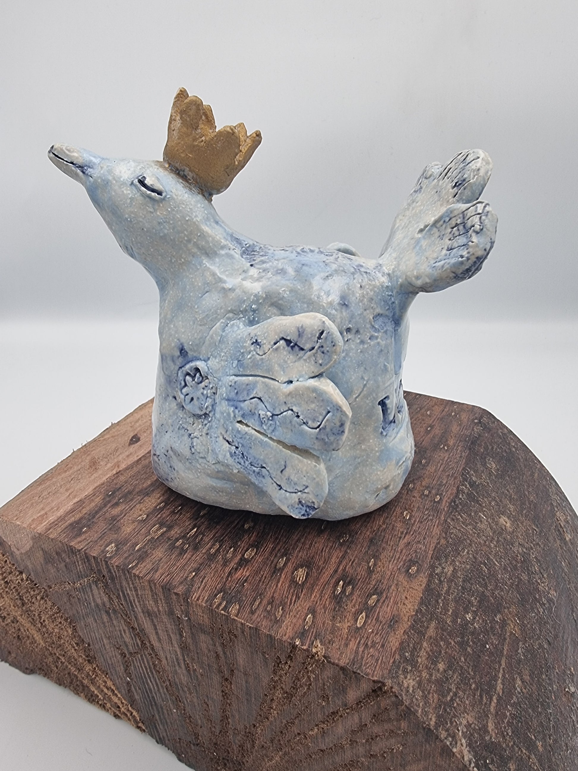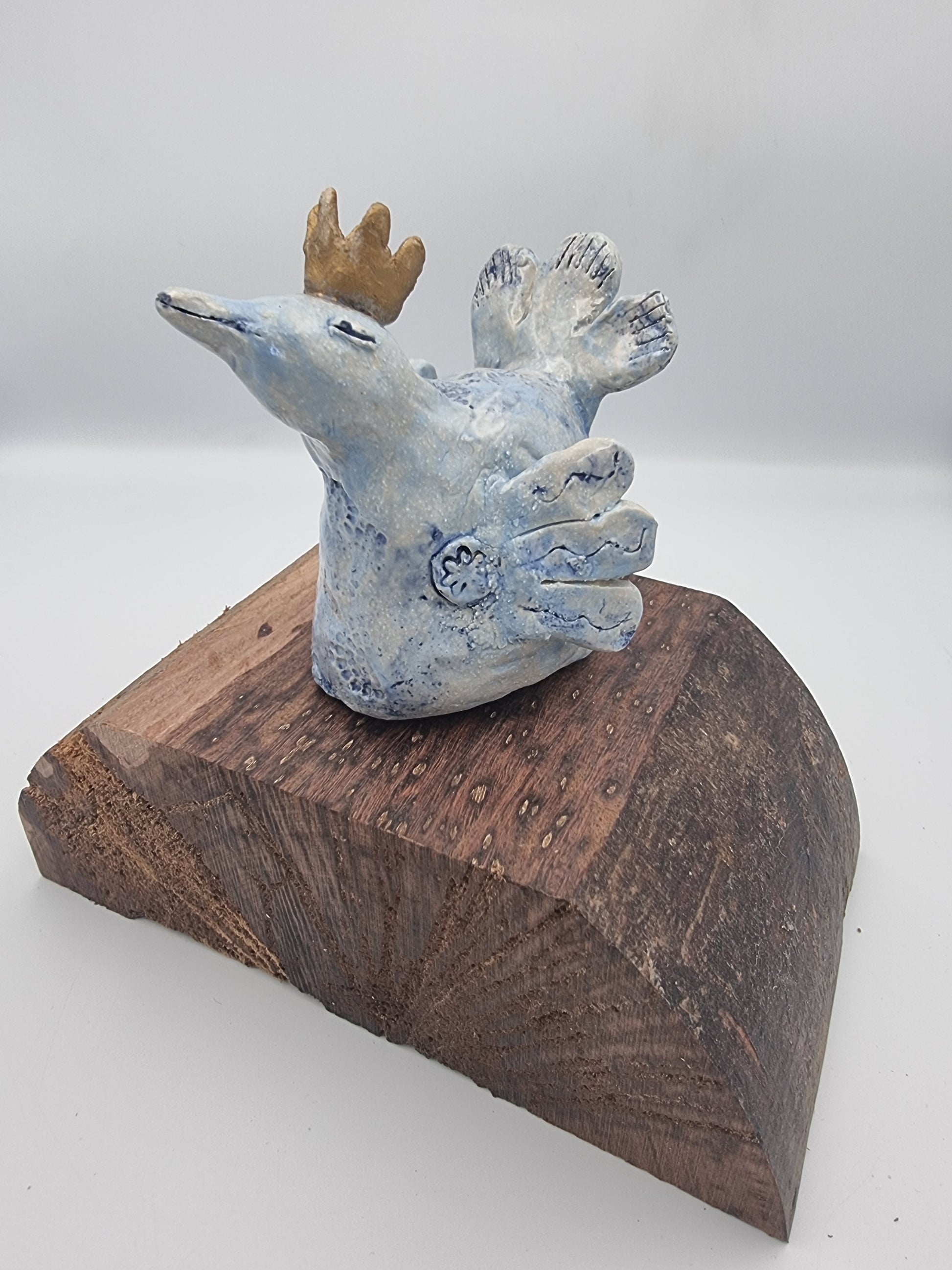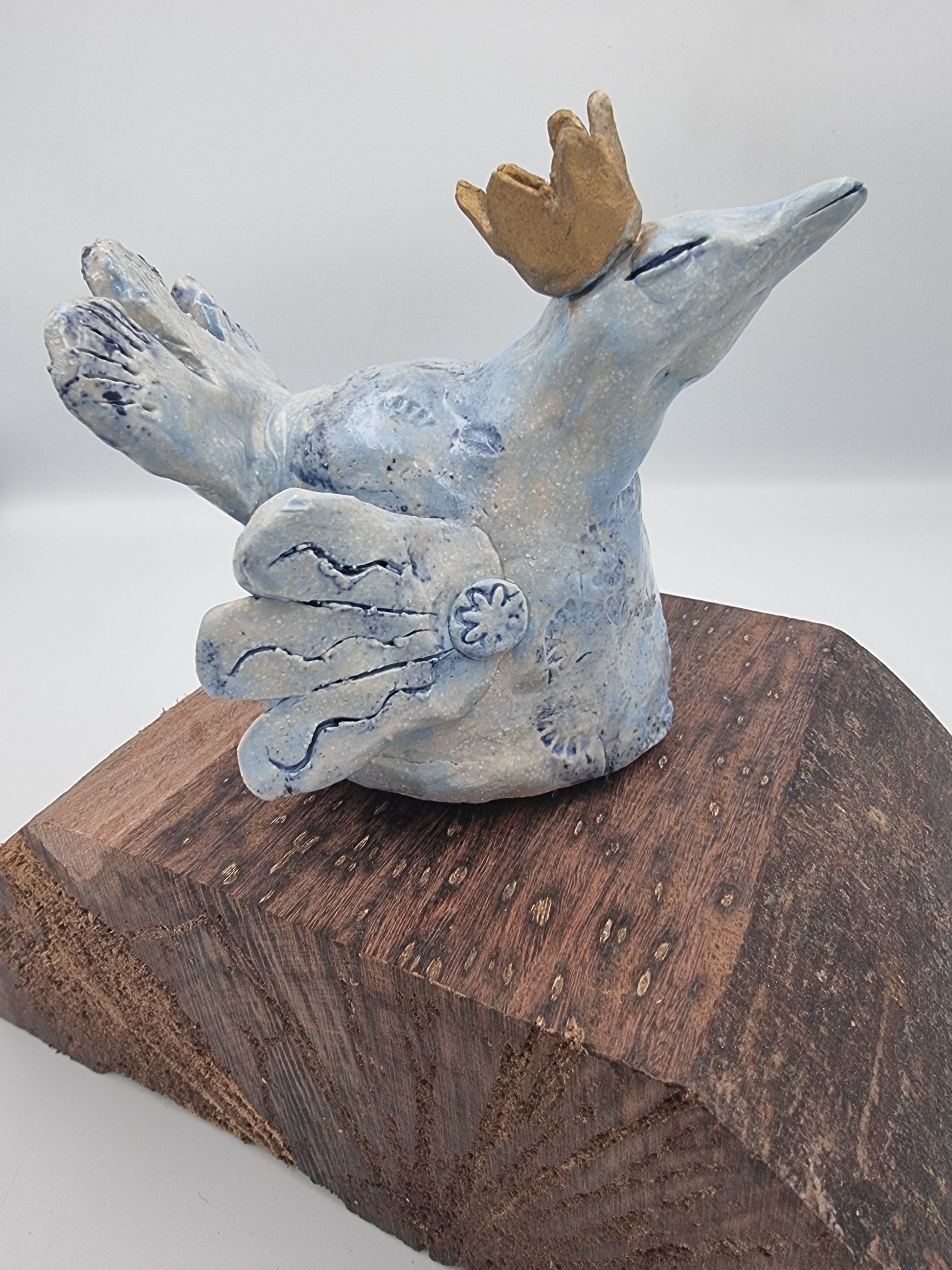 The bird is glazed in a glossy light blue, with imprints of flowers across her chest and lines on her wings and tail. Her crow in a matt gold.